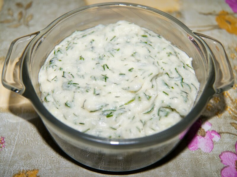 5. Соединить творожную массу с протёртым картофелем, луком и укропом, посолить по вкусу, тщательно перемешать.