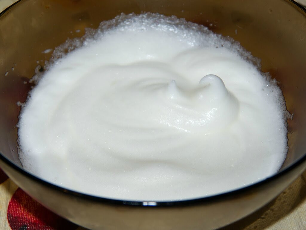 6. Охлажденные белки взбить до устойчивых пиков и аккуратными движениями сверху-вниз подмешать их к тыквенному пюре.