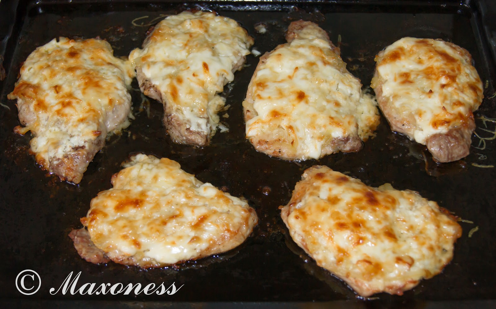 4. Противень смазать растительным маслом, положить на него обжаренное мясо, сверху выложить полукольца лука, посыпать сыром, натёртым на мелкой тёрке, и смазать майонезом.
